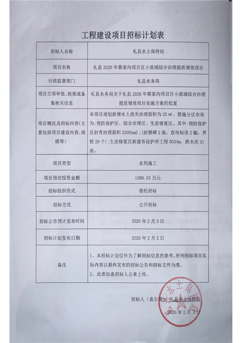 禮縣2026年蔡家溝項目區(qū)小流域綜合治理提質(zhì)增效項目