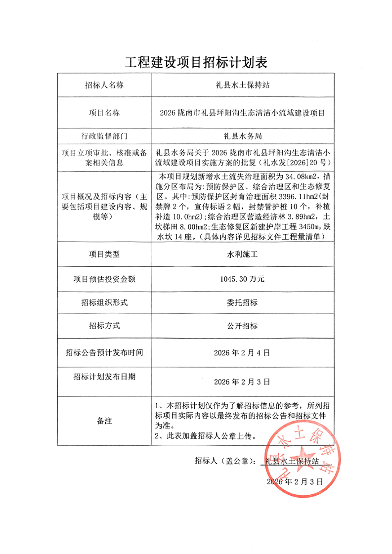 2026隴南市禮縣坪陽溝生態(tài)清潔小流域建設項目
