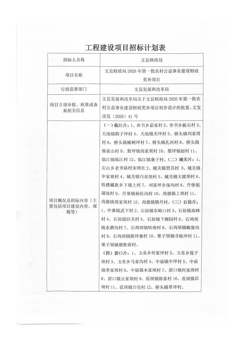 文縣財(cái)政局2026年第一批農(nóng)村公益事業(yè)建設(shè)財(cái)政獎(jiǎng)補(bǔ)項(xiàng)目