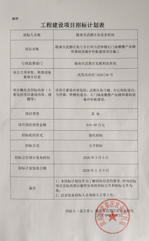 隴南市武都區(qū)角弓吉石壩馬營鐘樓石門油橄欖產(chǎn)業(yè)路和基礎(chǔ)設(shè)施補短板建設(shè)項目