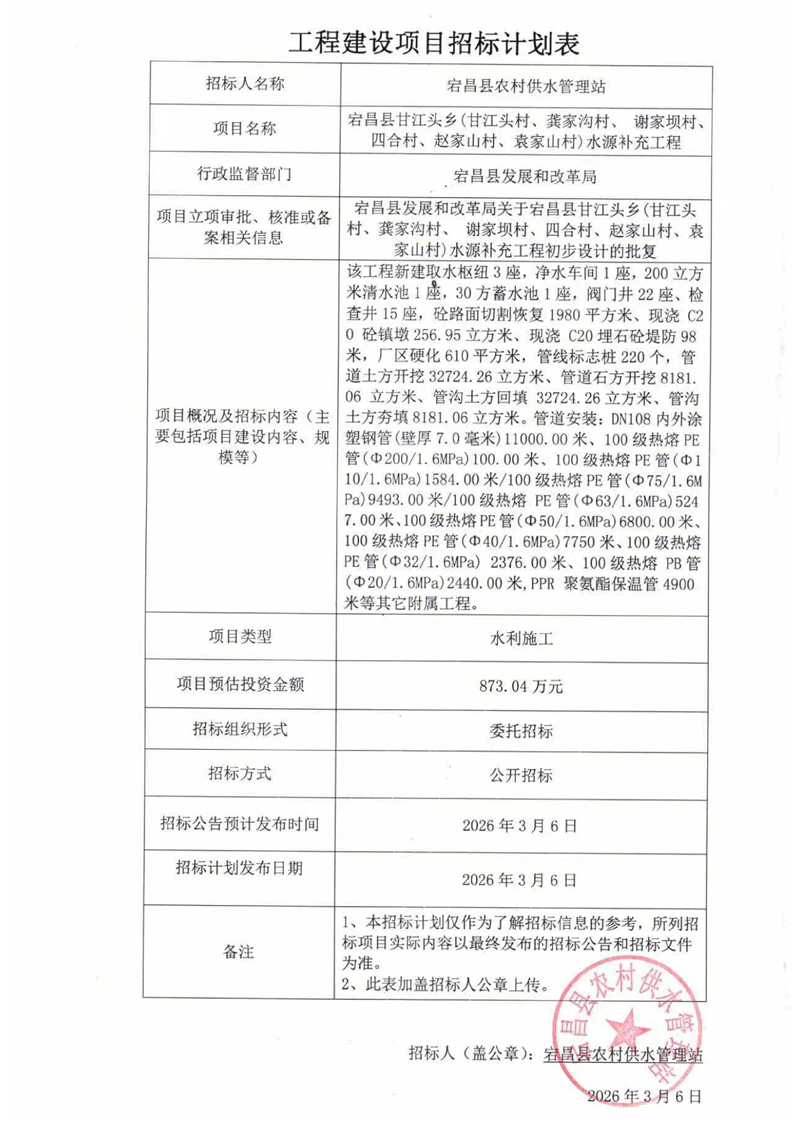宕昌縣甘江頭鄉(xiāng)(甘江頭村、龔家溝村、謝家壩村、四合村、趙家山村、袁家山村)水源補充工程