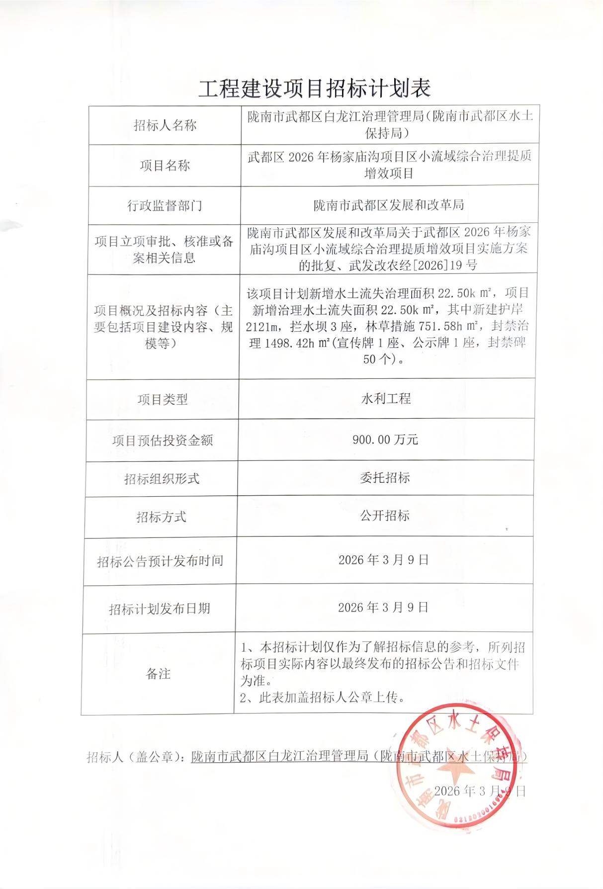 武都區(qū)2026年楊家廟溝項目區(qū)小流域綜合治理提質增效項目