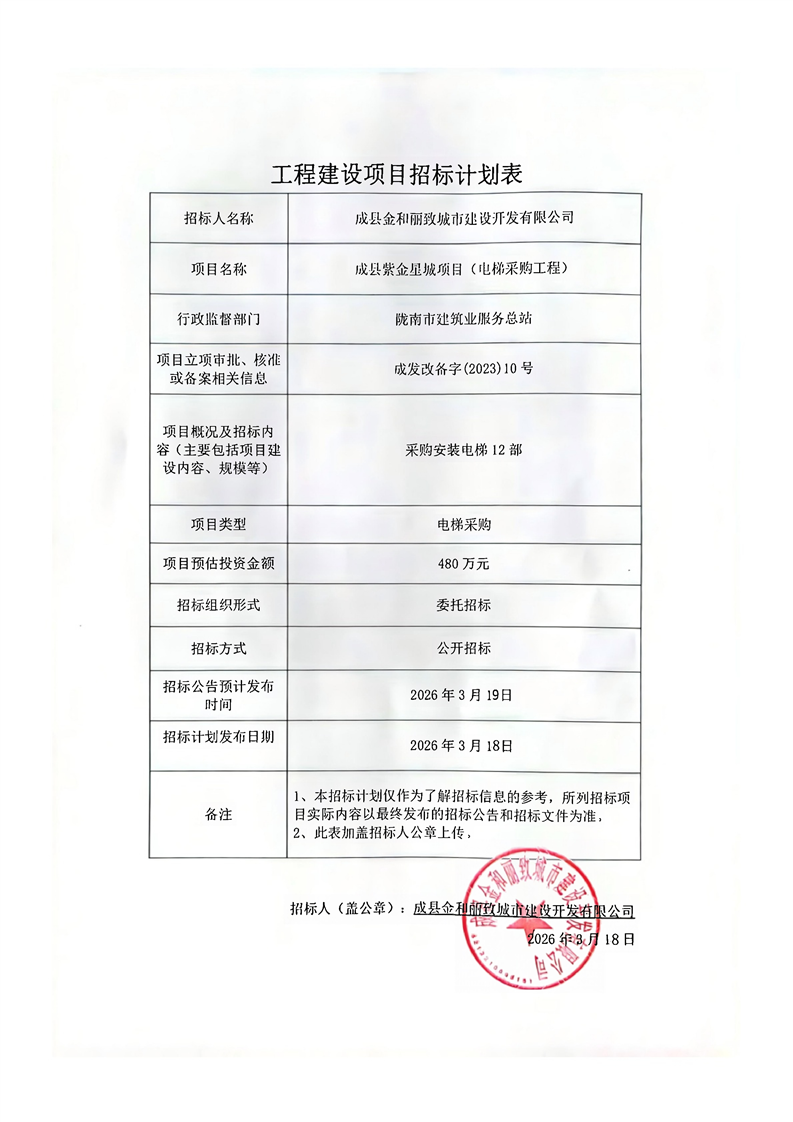 成縣紫金星城項(xiàng)目(電梯采購工程)