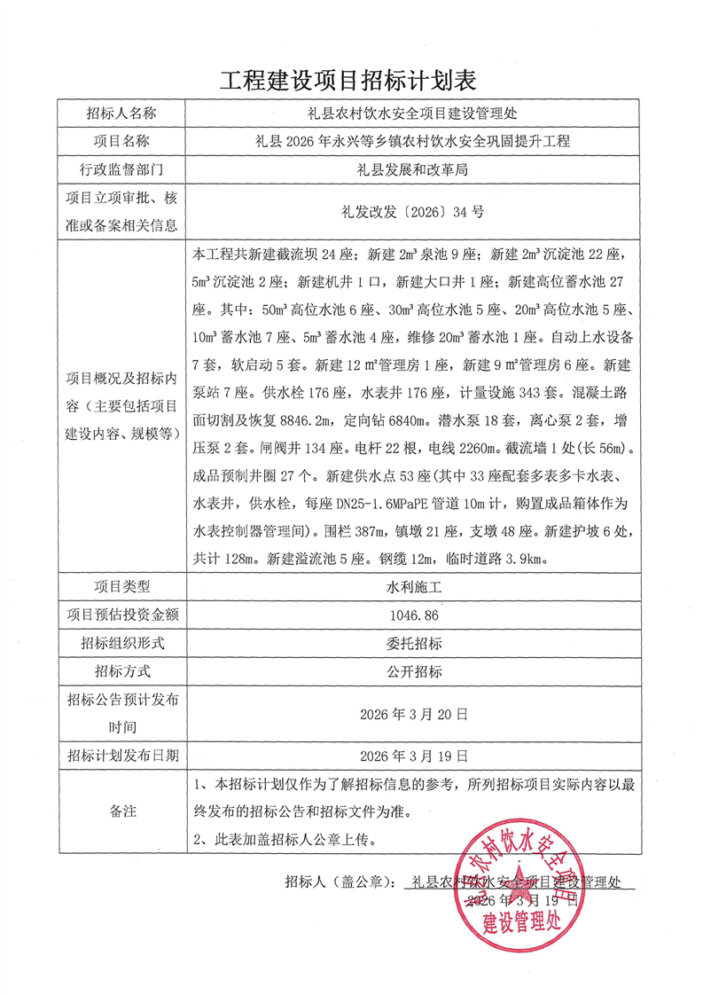 禮縣2026年永興等鄉(xiāng)鎮(zhèn)農(nóng)村飲水安全鞏固提升工程
